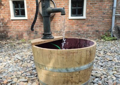 Deze kunnen van grootte variëren, waarbij we zoveel mogelijk rekening proberen te houden met de ijzeren ringen rondom het vat. De bakken zijn waterdicht en daardoor ook te gebruiken als minivijver voor uw vissen of waterplanten.